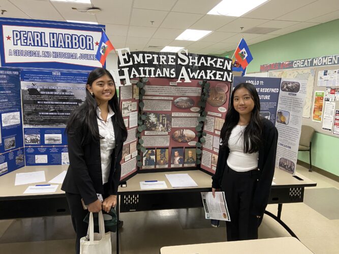 Yeshah Leones (left) and Jayleen Glapia of Maui High School stand for a photo in front of their project, “Empire Shaken Haitians Awaken,” at the Hawaii History Day district fair Saturday at the University of Hawaii Maui College. Courtesy photo