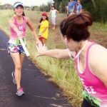 - Erin Koshiba hands off to Kailua Ladies teammate Kate Beres near Hookipa Beach Park during the Hana Relay on Saturday. — The Maui News / CHRIS SUGIDONO photo