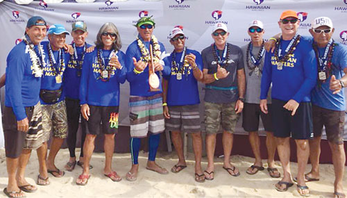 - Hawaiian Canoe Club’s (from left) Kevin Ledesma, Jerome Kalama, Tom Guerin, Wendall DeVera, John McCandless, Pia Aluli, Lex Rass, Frank Zajac, Mark Kazberten and Biggie Lara pose for photos after winning the 60-and-over division of the Molokai Hoe on Oct. 7. Missing are Lou Dionese and Tomas Schlotman. • Photo courtesy of Wendall DeVera