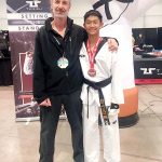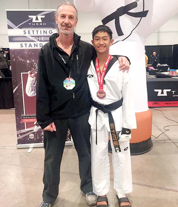 - Jerico San Agustin (right) poses with Master Gunter Kiffmann after winning the bronze medal in the junior sparring flyweight division at the U.S. Open Championships in Las Vegas earlier this month. MILES KIFFMANN photo