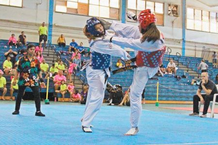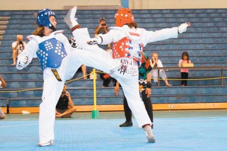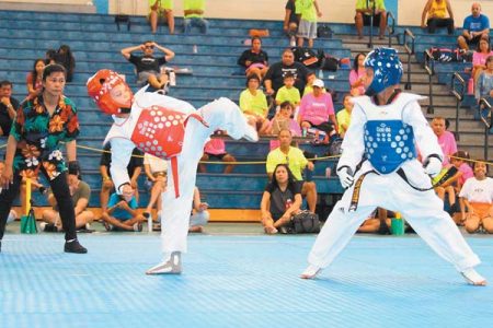 First photo: Travis Cohan (left) of Kiffmann’s Maui Elite Taekwondo takes on teammate Radyn Yap in the 10-11 youth male light division during the Maui Open Taekwondo Championship, held Sept. 7 at War Memorial Gym in Wailuku. Cohan won to take the gold, while Yap claimed silver. The tournament featured 150 participants from Hawaii, California, Washington and the Philippines. Second photo: Kiffmann’s Anisha Patterson (right) defeats heavyweight Kyleanne Rosario of California to win the 18-32 seniors female welterweight/heavyweight division. Third photo: Kiffmann’s Ziah Kealoha (right) defeats Miranda Vierra of Maui TKD in the 14-17 juniiors female lightweight division final.