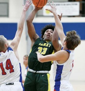 - Lanai’s Jamahl Adams shoots between Seabury Hall’s Cooper Waite (left) and Zachariah Burkett on Friday night. — The Maui News / MATTHEW THAYER photo