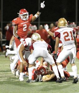 - Lahainaluna’s Devon Sa-Chisolm signals Lunas’ ball as teammate Tysyn Estrella covers a second-quarter fumble by Roosevelt in a state semifinal game on Nov. 23 at Sue Cooley Stadium. Lahainaluna defeated the Rough Riders 35-0 on the way to its fourth straight Division II state championship. This season, as the Lunas seek to move up to Division I, among the top players returning are Sa-Chisolm and Estrella.