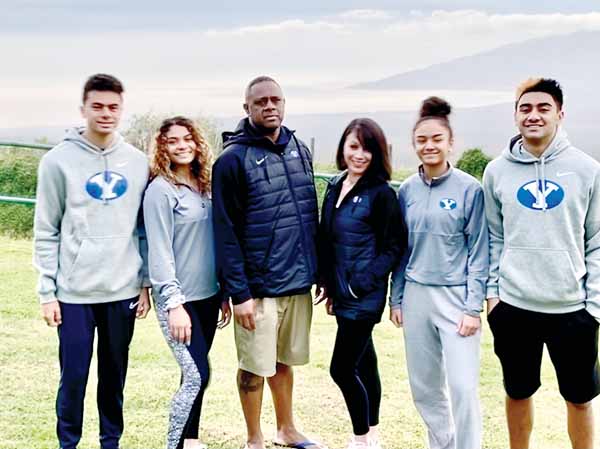 - The Damuni family — Dayson (from left), Selai, Jack, Shalei, Silina and Raider — pose for a photo at Rice Park in Kula during a family vacation in 2019. The family moved from Maui to Utah after Jack Damuni was hired to the football staff at BYU in 2016. Kealii Mossman photo