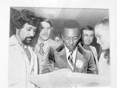 - In this framed photo from 1976, Guzman (left), then a reporter with the San Jose Mercury News, is pictured with Pele while the soccer great was playing for the New York Cosmos. Photo courtesy of Guzman family