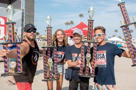 - Shawn Lewis (from left), Faith Lennox, Josh Bogle and Aaron Paulk hold their trophies at the USA Surfing Championships last week in Oceanside, Calif. Colie Marie Photography photos