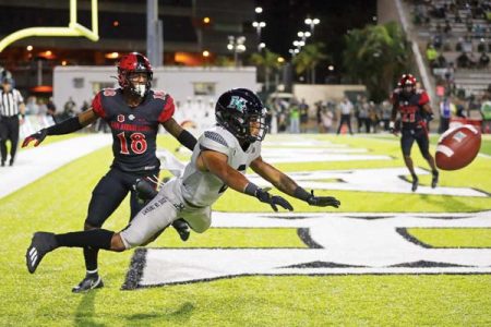 - Hawaii wide receiver Zion Bowens can’t pull in a catch during the second half of the Rainbow Warriors’ 17-10 loss to San Diego State on Saturday. AP photo