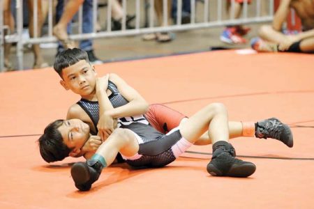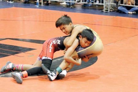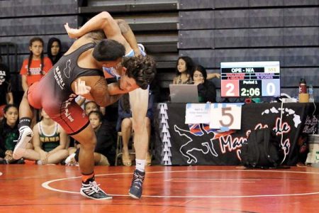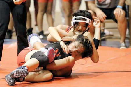 FIRST PHOTO: Chaela Gantala of Maui Tiger Style Wrestling scores a 10-5 win over over Cailee Cuaresma of the Napili Surfriders during a 14U girls 119-pound match at the Hawaii USA Wrestling Folkstyle Championships on Saturday at Lahaina Civic Center. Over 330 wrestlers from 14 clubs competed in the first state tournament since 2019 (the 2020 and 2021 tourneys were canceled due to COVID-19). 808 Wrestling, a Kahului club, captured the team title with 16 individual champions. SECOND PHOTO: Joseph Hidalgo of Napili tosses Nainoa Flores of 808 in an open division match. THIRD PHOTO: Boys 12U 63 champion Akamu Flores of 808 defeats Liam Hirouji of Napili 15-9. FOUTH PHOTO: Siana Vasquez of the Lahaina Roughnecks rides Kaimaile Stone of Molokai Wrestling Club at 14U girls 136. FIFTH PHOTO: Uriyah Ragudo of Napili wins by fall over Nelson Saribay of Maui Tiger Style at 12U boys 82. For results from the meet, see Valley Isle Scoreboard.