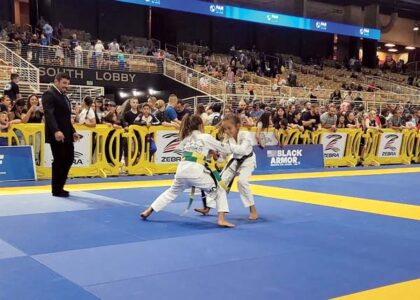 - Taupou Grove (right) takes on twin sister Telia in the Female Pee-Wee 3 Light Division final of the Pan Kids IBJJF Jiu-Jitsu Championships on Saturday in Kissimmee, Fla. Taupou defeated Telia in the final. Photos courtesy of Kendall Grove