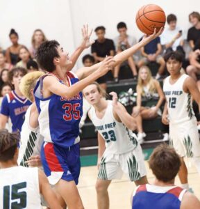- The Spartans’ Zack Devane shoots between Maui Prep’s Cameron Henry (right) and Kai Shively in the third quarter.