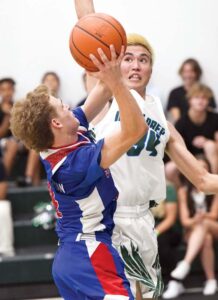 - Na Pueo’s Kai Godwin defends a second-quarter shot by Seabury Hall’s Dylan Stolley.