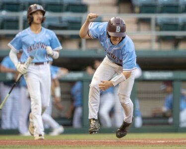- Baldwin High School’s Jayson Kahaleanu celebrates after scoring the go-ahead run in the bottom of the sixth inning as the Bears defeated Mililani 2-1 in a Division I state semifinal game Thursday at Les Murakami Stadium. ScoringLive.com / Michael Lasquero photos