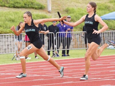 The King Kekaulike girls 400 relay will be competing today, too, after claiming the third championship spot with a time of 50.11. Mililani has the top seed with a 49.08 and Punahou (50.02) is second.