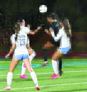 - King Kekaulike’s Tori Zackious launches a long header between Baldwin’s Olivia Ellis (from left), Sammi Kinoshita and Mattison Akiona to score a first-half goal Wednesday.