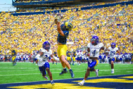 - Roman Wilson makes a leaping catch in the end zone for one of his three touchdowns during the Wolverines’ 30-3 win over East Carolina on Sept. 2. Michigan Photography via University of Michigan Athletics photo