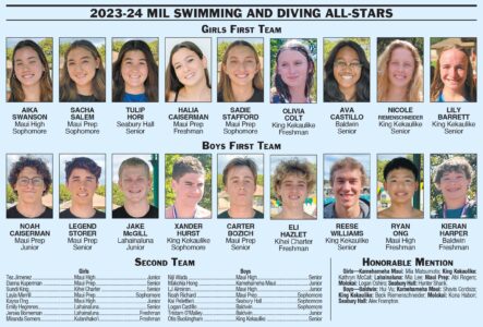 Caiserman is joined on the MIL boys first team by MPA teammates Legend Storer and Carter Bozich; Lahainaluna’s Jake McGill; King Kekaulike’s Xander Hurst and Reese Williams; Kihei Charter’s Eli Hazlet; Maui High’s Ryan Ong; and Baldwin’s Kieran Harper, the MIL diving champion.
