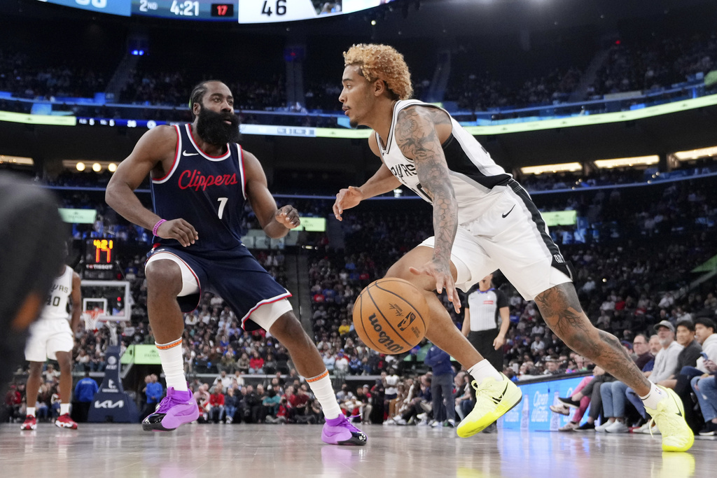 San Antonio Spurs forward Jeremy Sochan, right, drives past Los Angeles Clippers guard James Harden during the first half of an NBA basketball game, Monday, Nov. 4, 2024, in Inglewood, Calif. (AP Photo/Mark J. Terrill)