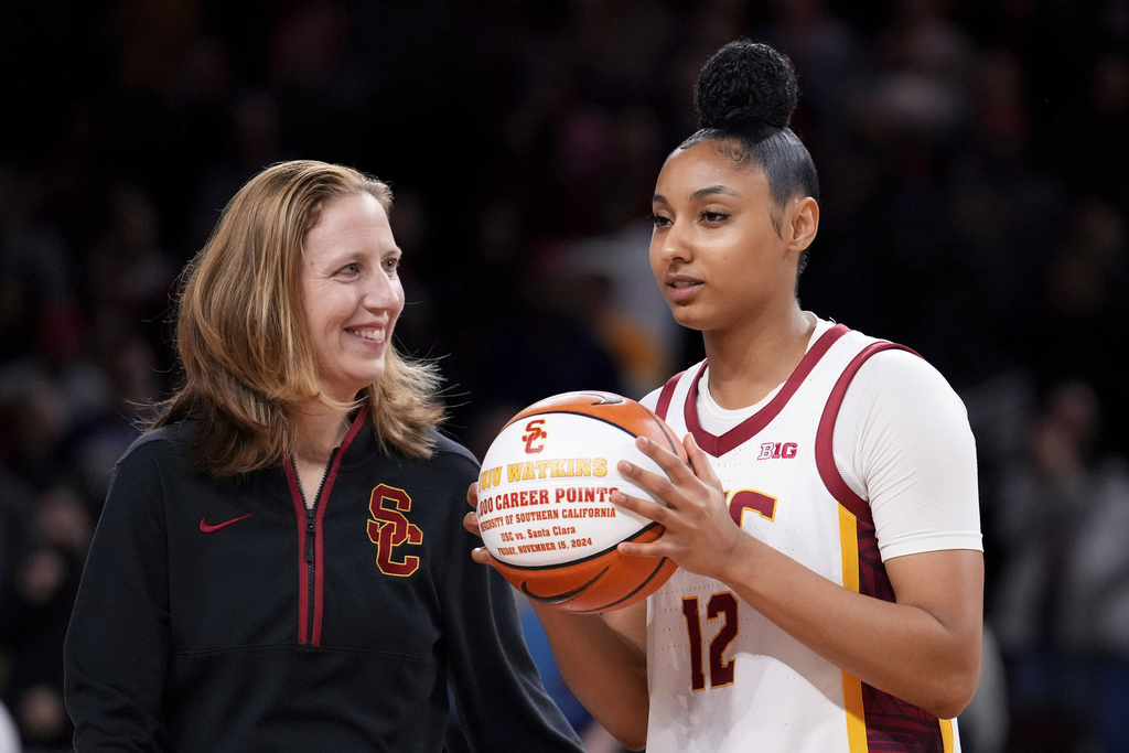 Southern California guard JuJu Watkins, right, holds a ball to commemorate scoring 1,000 career points as she stands with head coach Lindsay Gottlieb prior to an NCAA college basketball game against Michigan, Sunday, Dec. 29, 2024, in Los Angeles. (AP Photo/Mark J. Terrill)