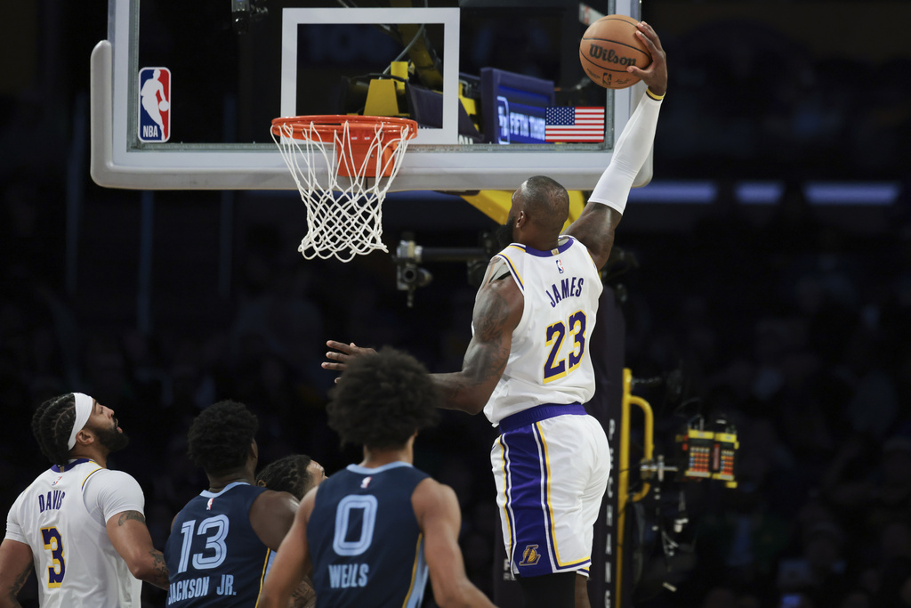Los Angeles Lakers forward LeBron James (23) dunks the ball as forward Anthony Davis (3), Memphis Grizzlies forward Jaren Jackson Jr. (13) and forward Jaylen Wells (0) watch during the first half of an NBA basketball game, Sunday, Dec. 15, 2024, in Los Angeles. (AP Photo/Jessie Alcheh)