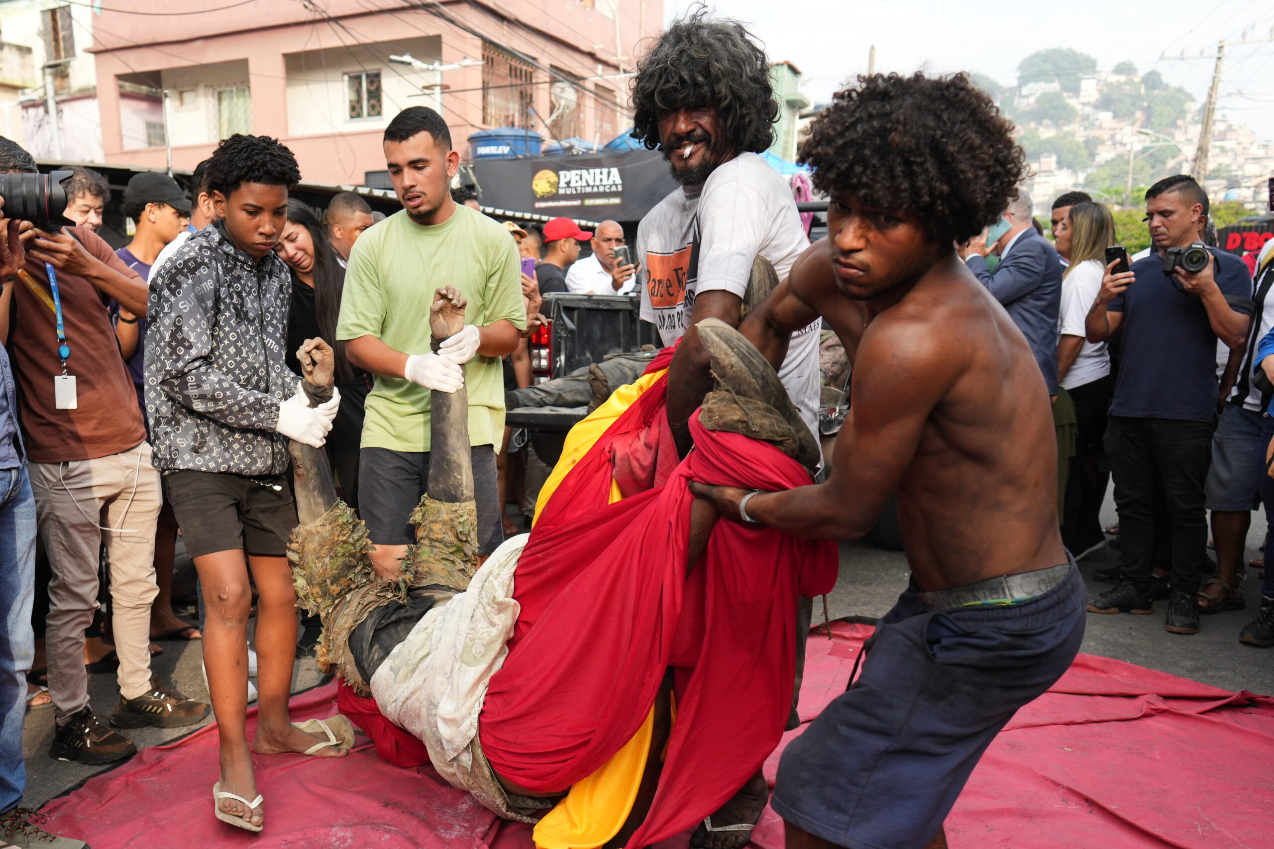 Resident carry the body of a man killed during a police raid targeting the Comando Vermelho gang in the Complexo da Penha favela of Rio de Janeiro, Brazil, Wednesday, Oct. 29, 2025. (AP Photo/Silvia Izquierdo)