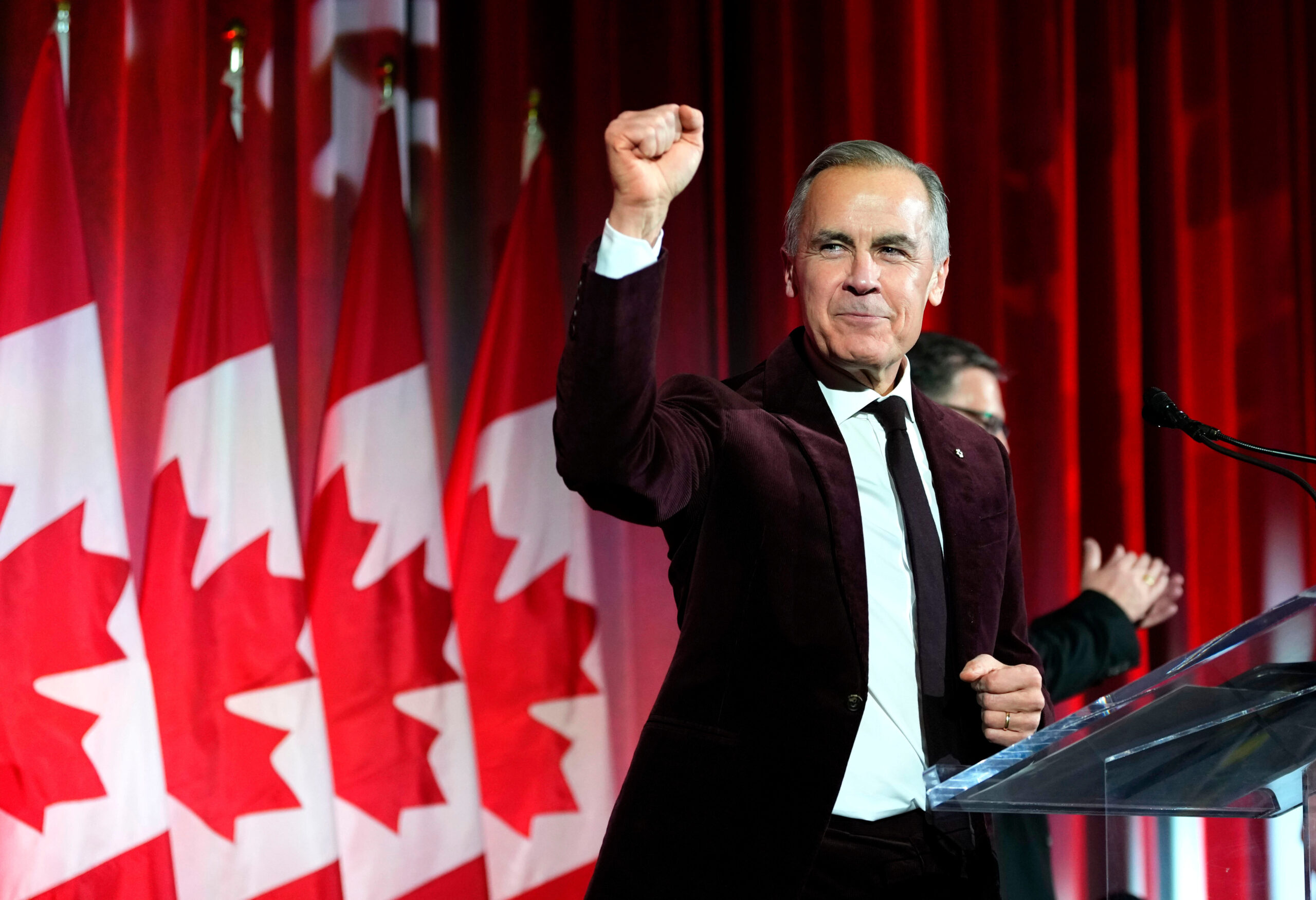 FILE - Canada's Prime Minister Mark Carney pumps his fist as he arrives to deliver remarks at the Liberal caucus holiday party in Ottawa, on Thursday, Dec. 11, 2025. (Justin Tang/The Canadian Press via AP, File)