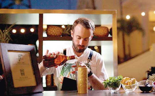 Mixologist Ben Yabrow crafts modern tropical cocktails at the Lobby Lounge in the Four Seasons Resort Maui at Wailea. -- Four Seasons Resort Maui photo
