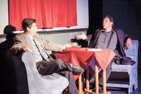 - Jefferson Davis (left) and Geronimo Son contemplate the ultimate sin — murder — in “Strangers on a Train,” concluding its run this weekend at ProArts Playhouse in Kihei. Call 463-6550 or visit www.proartsmaui.com for tickets. PETER SWANZY photo