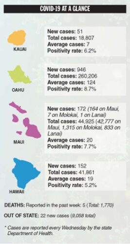 OAHU: New cases: 722 • Total cases: 260,928 • Average cases: 112 • Positivity rate: 8.2%