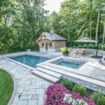 This 2017 photo provided by Grunder Landscaping shows a contrasting mix of long-flowering plants separated from the pool water by a walkway in Dayton, Ohio. Poolside landscaping is a bit more demanding than the usual. Container plants can be moved to follow the sun while trees are kept well in the background to help prevent leaf litter. (Peter Winburg/Grunder Landscaping via AP)