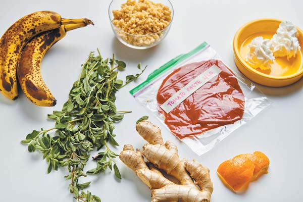 Many foods are surprisingly freezable such as (from left) bananas, fresh oregano, cooked quinoa in glass bowl, ginger, tomato paste, orange peel and whipped cream mounds. -- AP photo