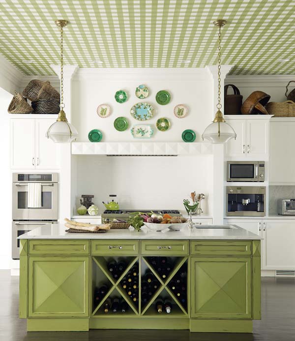 - Designer Gideon Mendelson was tasked with creating a classic white kitchen, but he wanted to add some personality. “The client loved checks and plaids, so a decorative painter painted a green checkered design on a canvas and then installed it on the ceiling. The color matches the green on the kitchen island, so it ties the room together and makes the space feel that much more special.” — Mendelson Group / Eric Piasecki photo via AP