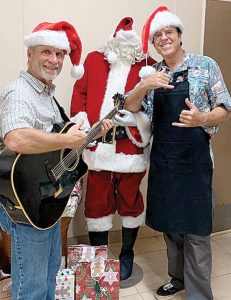 - Last December, Realtors from Island Sotheby’s International Realty’s South Maui office joined forces with volunteers from Fidelity National Title Insurance Co., and the Kiwanis Club of Kahului to serve a holiday-themed dinner to more than 70 adults and children at KHAKO. To elevate the festive ambiance, Maui singer-songwriter Brooks Maguire (left) serenaded the dinner guests as Santa hat-wearing volunteers like Patrick Kilbride (right) handed out donated gifts to the kids. — Photo courtesy Patrick Kilbride