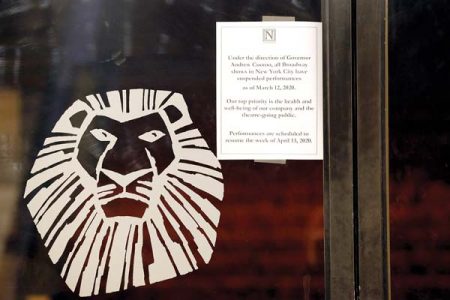 - A sign announcing the suspension of all Broadway shows is posted on a door at the Minskoff Theatre, where “The Lion King” had been playing last week in New York. — AP photo