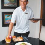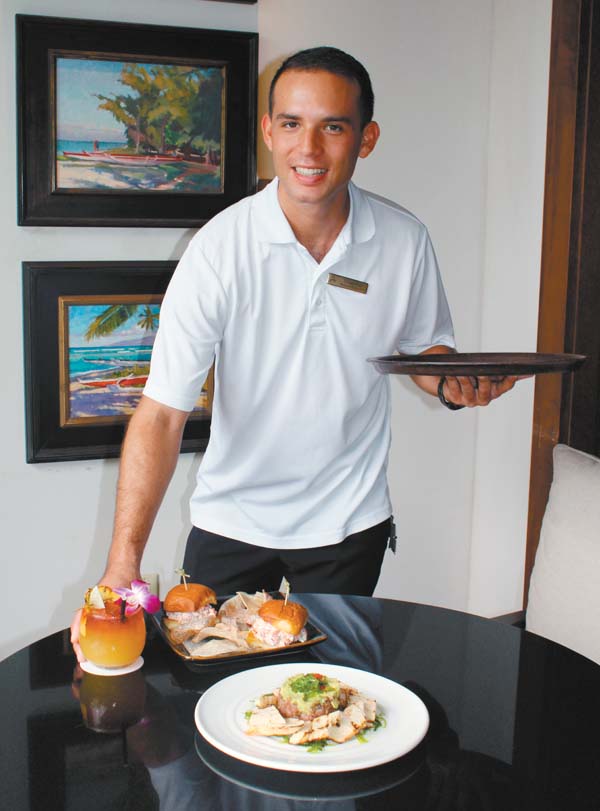 Server Brandon Allred of Cane & Canoe Bar at the Montage Kapalua Bay delivers a famous mai tai, Kona lobster roll sliders and limu ahi tartare with avocado, onion and ginger during happy hour that runs daily through September. CARLA TRACY photo